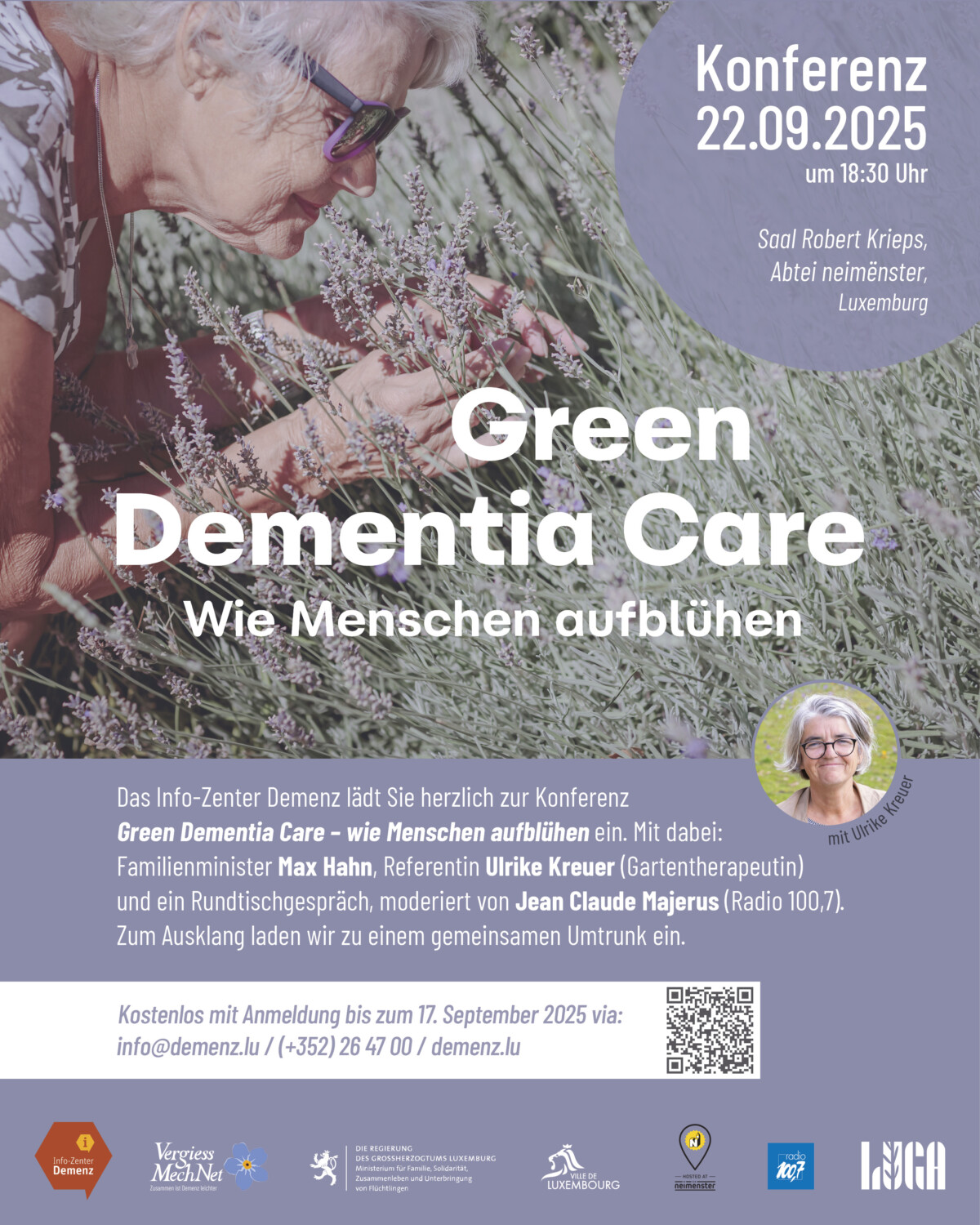 Am 22. September 2025 um 18h30 organisiert das Info-Zenter Demenz in der Abtei neimënster eine Konferenz für Professionelle und Angehörige von Menschen mit Demenz zum Thema „Green Dementia Care − wie Menschen aufblühen“.